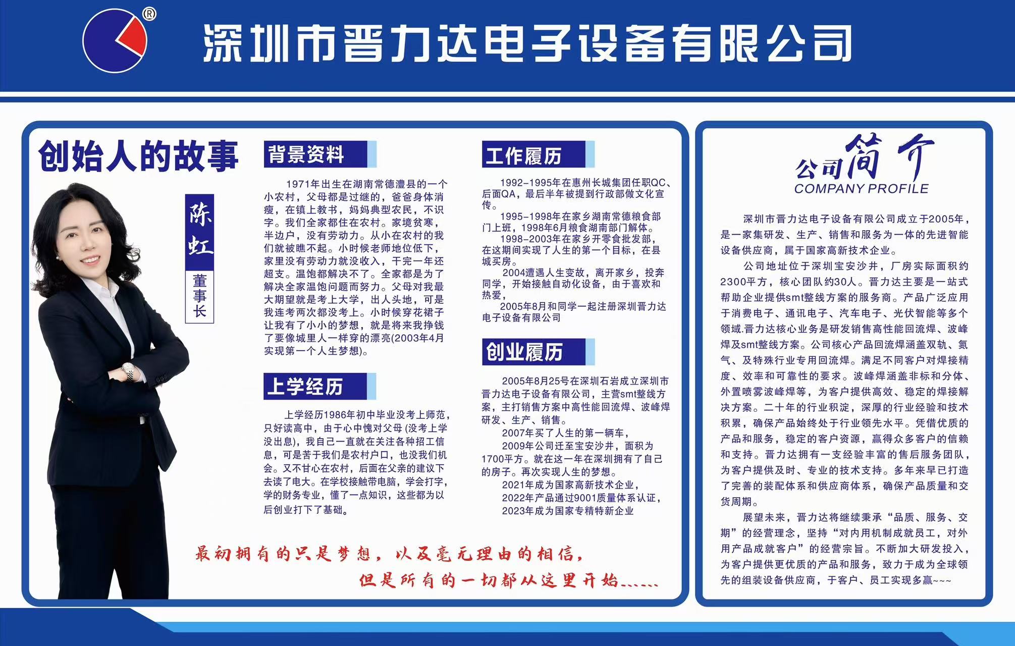 深圳市晉力達電子設(shè)備有限公司成立于2005年,主要從事高性能環(huán)保無鉛回流焊、無鉛波峰焊SMT等周邊設(shè)備的研制開發(fā)、生產(chǎn)銷售為一體的專業(yè)流水線配套生產(chǎn)設(shè)備企業(yè)。優(yōu)良的產(chǎn)品質(zhì)量和 先進的技術(shù)使我們與客戶們建立了良好的關(guān)系,并讓我們在同行業(yè)中擁有良好的聲譽。遵循“誠信、務(wù)實、精益、創(chuàng)新、環(huán)保”的企業(yè)文化,堅持以技術(shù)差異化創(chuàng)造 市場機會,秉承以高技術(shù)、高品質(zhì)、優(yōu)服務(wù)為宗旨,堅持國際化、標準化、專業(yè)化的方針,我們將為您提供優(yōu)質(zhì)的設(shè)備和優(yōu)良的服務(wù)。我們倡導誠信變通、簡單、高 效、樂觀敬業(yè)的激情創(chuàng)業(yè)文化,我們致力于用技術(shù)為客戶提供更好的體驗和服務(wù),與客戶員工共同成長,實現(xiàn)多贏!