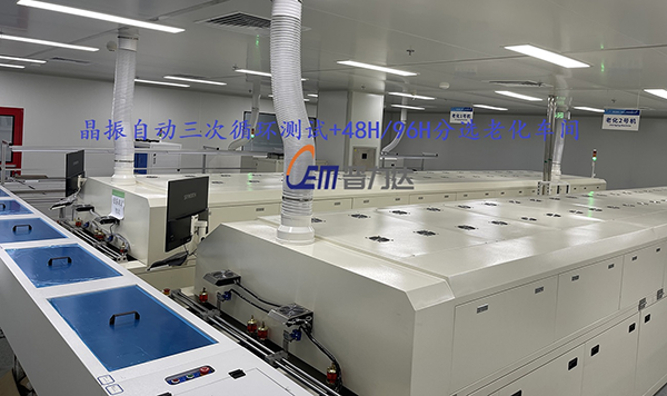 下圖為惠倫晶體重慶分公司自動測試+老化線,實際模擬晶振產(chǎn)品在經(jīng)過自動上板進入三次回流焊烘烤后產(chǎn)品是否存在可靠性問題,并經(jīng)由視覺掃碼分選進入后端48H和96H老化爐,出口自動收板,達到客戶晶振每月產(chǎn)能60000K(拍攝照片經(jīng)由客戶同意)