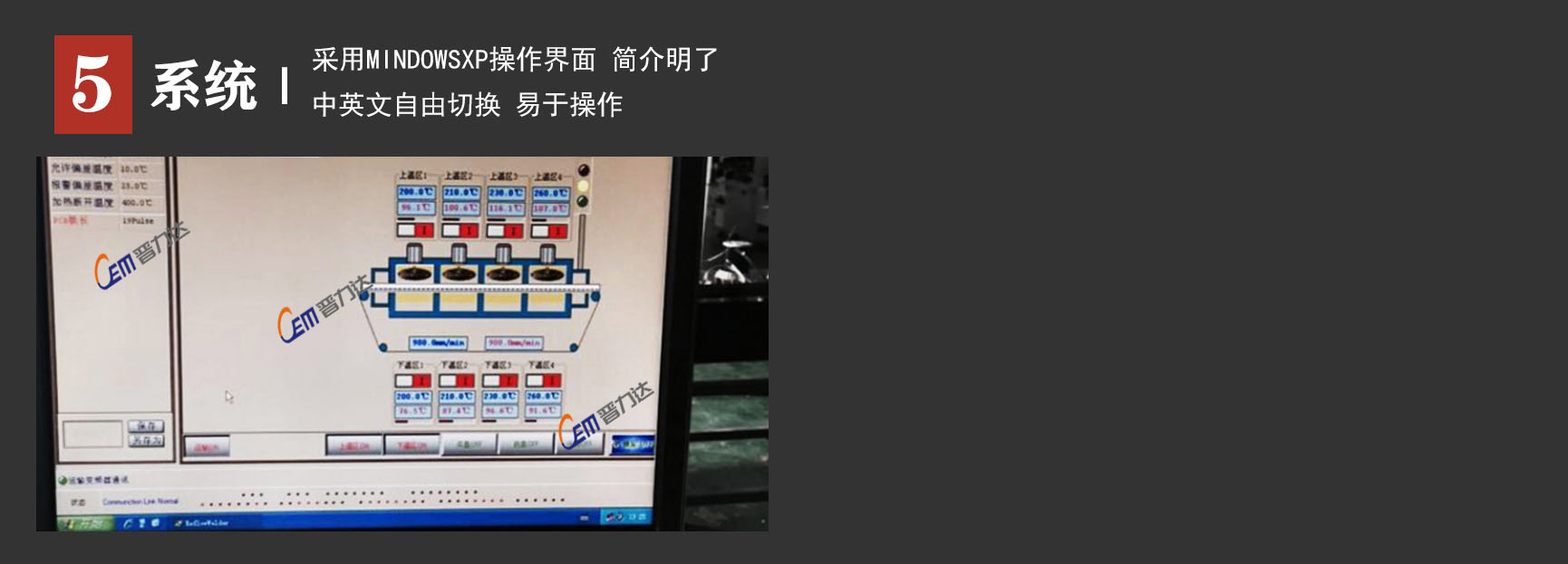 6 Windows 視窗操作系統(tǒng),中英文界面,操作人性化,簡單;電腦控制與緊急手動停止按鈕,具有安全保障功能;