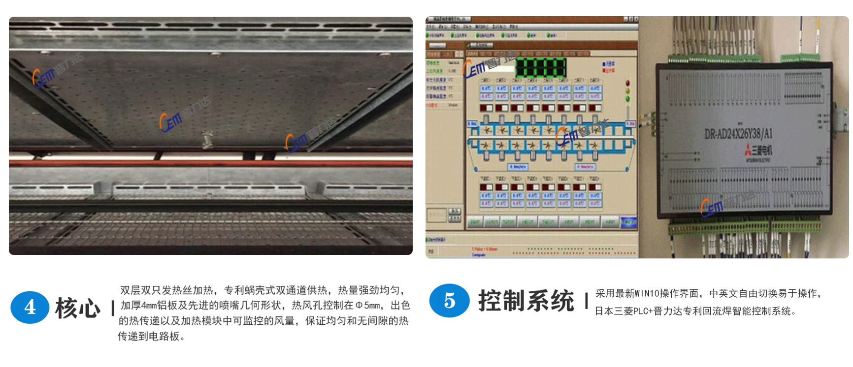 2、采用瑞士CARLO(佳樂)大電流固態(tài)繼電器無觸點(diǎn)輸出,安全、可靠,結(jié)合溫控器特有的模糊控制功能,一直監(jiān)視外界溫度及熱量值的變化,以低脈沖控制發(fā)熱器件,快速作出反應(yīng),保證溫控精度±1℃,機(jī)內(nèi)溫度分布誤差在±2℃以內(nèi),長度方向溫度分布符合IPC標(biāo)準(zhǔn)