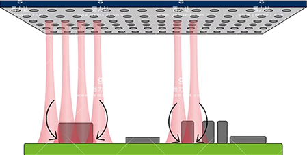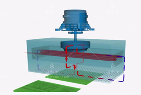 7、由于先進(jìn)的孔噴嘴幾何形狀,出色的熱傳遞以及加熱模塊中可監(jiān)控的可調(diào)超壓,保證均勻和無間隙的熱傳遞到電路板。整個過程可以保證惰性工藝氣氛焊接過程,因為是封閉的系統(tǒng),沒有外部空氣進(jìn)入處理室。 熱流在系統(tǒng)內(nèi)通過循環(huán)發(fā)生,即過程預(yù)熱和峰值區(qū)域的氣體被提取,清洗并從側(cè)面重新插入過濾網(wǎng)。